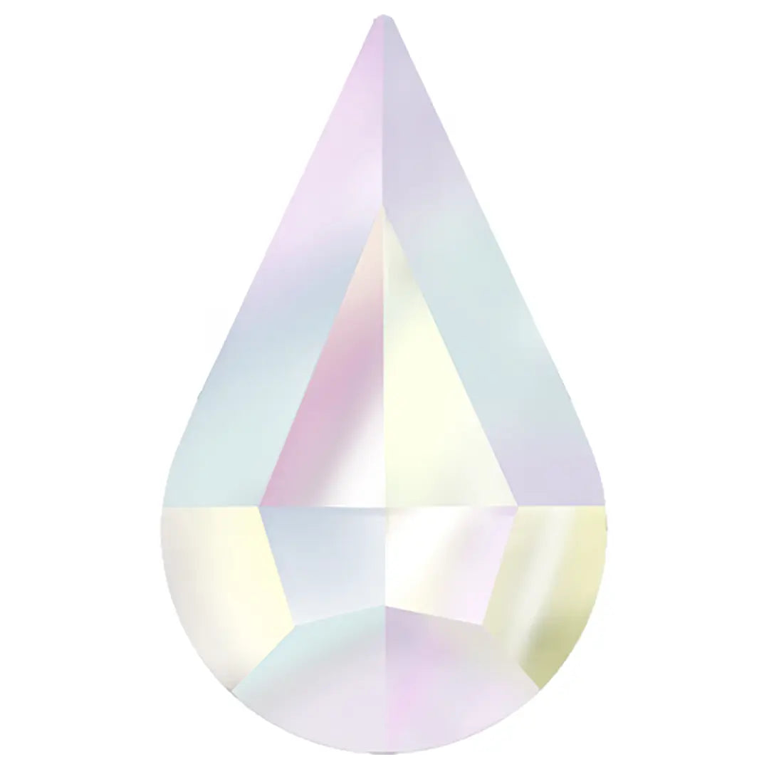 Estella rhinestones non hotfix Drop in Crystal AB are flat back crystals that can easily be applied to most surfaces with glue. Estella Drop shaped crystals are characterized by their teardrop shaped design, which gradually tapers from a narrower top to a wider bottom, resembling a droplet or tear.