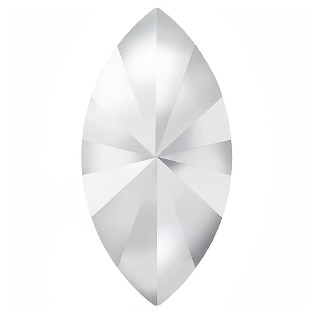 Estella rhinestones non hotfix Navette in Crystal are flat back crystals that can easily be applied to most surfaces with glue. Estella Navette shaped crystals are elongated and pointed at both ends, resembling a narrow leaf or an almond. The crystal has a flat top surface and bevelled edges that catch and reflect light, creating a sparkling effect that enhances its overall appearance.