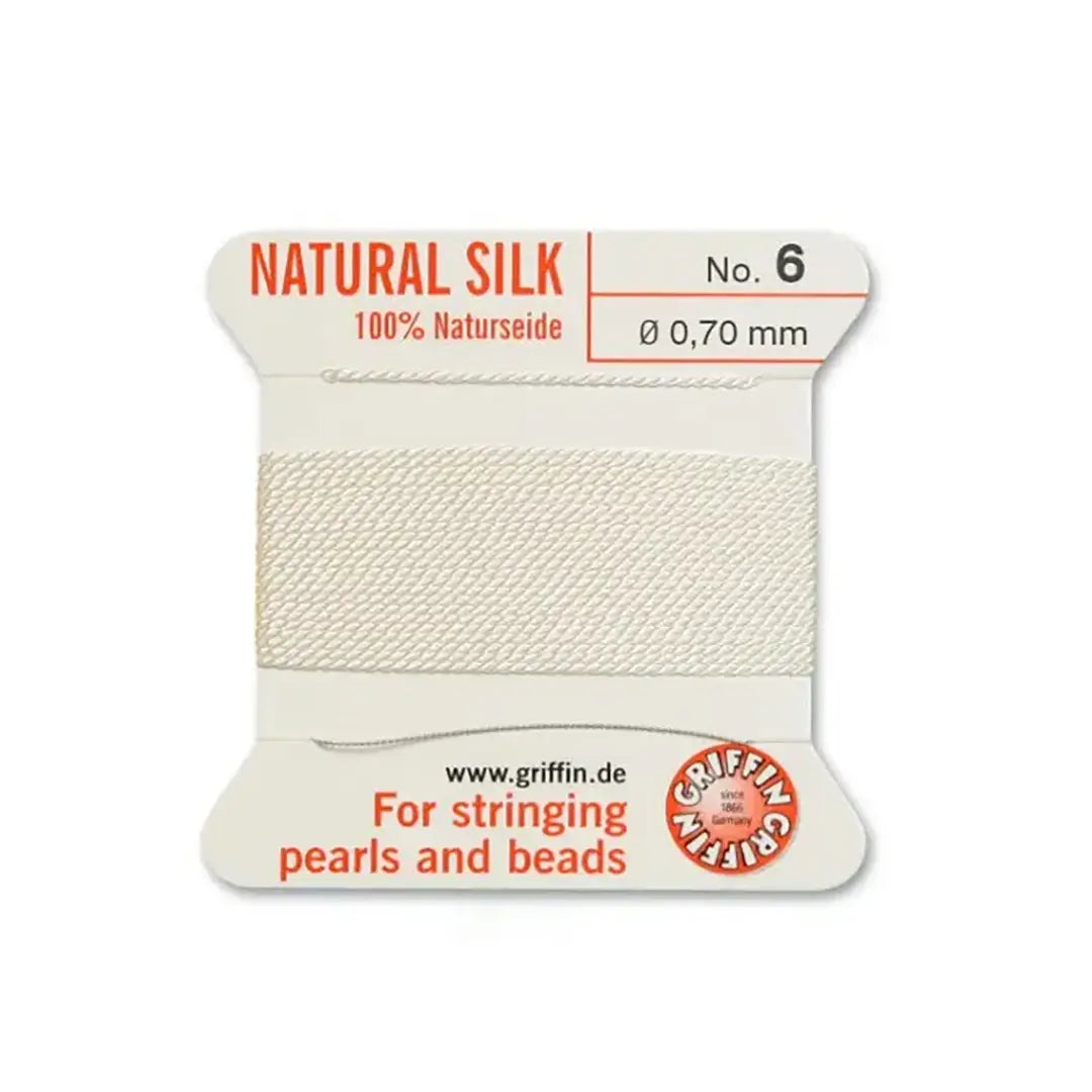 Griffin Silk white thread is a popular choice among jewellers and is available in a range of diameters. The silk comes with an attached needle so there is no need to double over the thread when bead stringing, making it much easier to thread beads, especially with small holes.