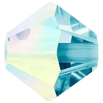 Preciosa crystal beads Bicone in Aquamarine AB have a smooth thread hole and are multi-faceted to reflect the light, making them perfect to create bespoke designs. Preciosa Bicone Beads have a cylindrical shape and taper towards both ends to create a unique bi-conical shape. The multi-faceted surface of these beads, which narrows towards each end, adds texture, depth, and sparkle to different jewellery and custom-made designs.