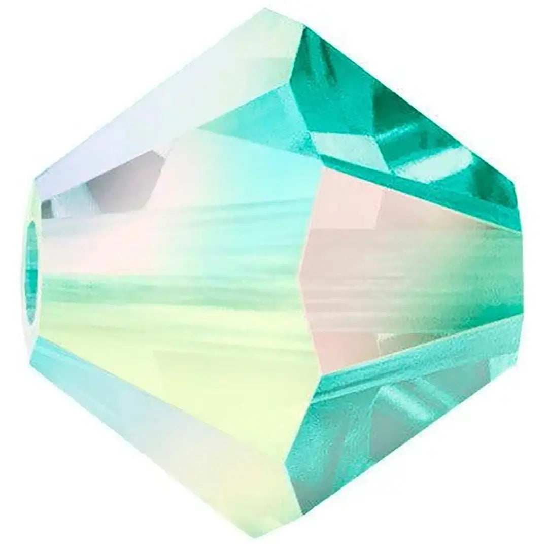 Preciosa crystal beads Bicone in Blue Zircon AB 2X have a smooth thread hole and are multi-faceted to reflect the light, making them perfect to create bespoke designs. Preciosa Bicone Beads have a cylindrical shape and taper towards both ends to create a unique bi-conical shape. The multi-faceted surface of these beads, which narrows towards each end, adds texture, depth, and sparkle to different jewellery and custom-made designs.