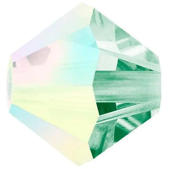 Preciosa crystal beads Bicone in Chrysolite AB have a smooth thread hole and are multi-faceted to reflect the light, making them perfect to create bespoke designs. Preciosa Bicone Beads have a cylindrical shape and taper towards both ends to create a unique bi-conical shape. The multi-faceted surface of these beads, which narrows towards each end, adds texture, depth, and sparkle to different jewellery and custom-made designs.