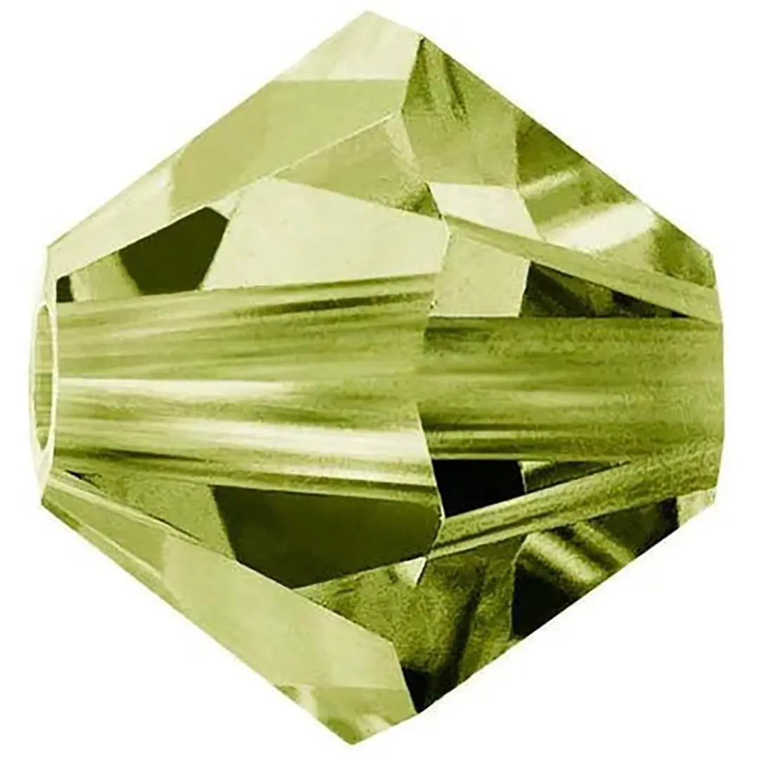 Preciosa crystal beads Bicone in Olivine have a smooth thread hole and are multi-faceted to reflect the light, making them perfect to create bespoke designs. Preciosa Bicone Beads have a cylindrical shape and taper towards both ends to create a unique bi-conical shape. The multi-faceted surface of these beads, which narrows towards each end, adds texture, depth, and sparkle to different jewellery and custom-made designs.