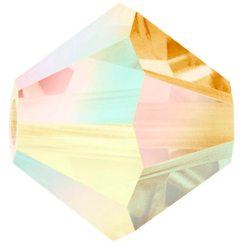 Preciosa crystal beads Bicone in Topaz AB 2X have a smooth thread hole and are multi-faceted to reflect the light, making them perfect to create bespoke designs. Preciosa Bicone Beads have a cylindrical shape and taper towards both ends to create a unique bi-conical shape. The multi-faceted surface of these beads, which narrows towards each end, adds texture, depth, and sparkle to different jewellery and custom-made designs.