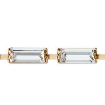 Preciosa Cup Chain Baguette (Silver) in Crystal AB, also known as rhinestone chain, is a string of baguette shaped crystals embedded in a setting and connected together to form a light and flexible crystal chain. Often used in both jewellery making and to embellish garments, cupchains can be soldered, plated, and sewn by hand or machine.