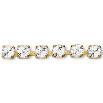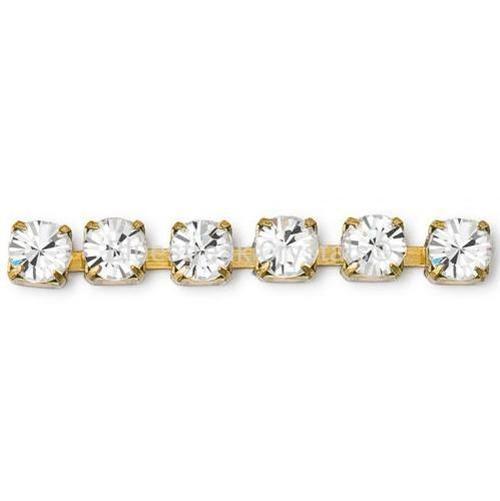 Preciosa Cupchain Chaton Round Gold in Crystal, also known as rhinestone chain, is a string of baguette shaped crystals embedded in a setting and connected together to form a light and flexible crystal chain. Often used in both jewellery making and to embellish garments, cupchains can be soldered, plated, and sewn by hand or machine.