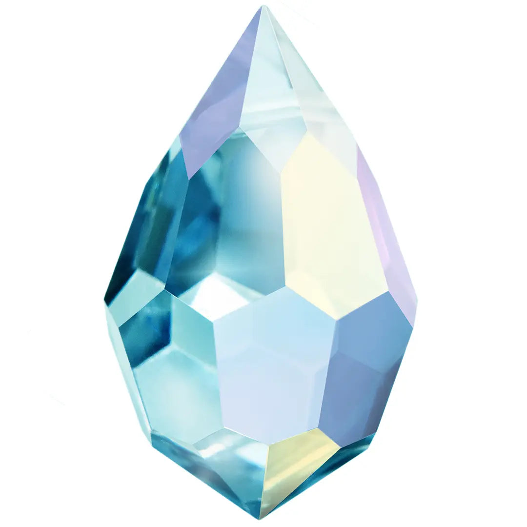 Preciosa pendants Drop 681 in Aqua Bohemica AB are multi faceted crystals with a thread hole at the top enabling them to be attached to a chain or finding to create a piece of jewellery. Preciosa drop shaped crystals are designed in a distinctive teardrop shape, with a smaller tapered top and wider bottom resembling a water droplet or tear.