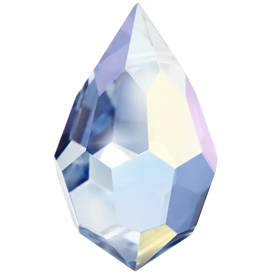 Preciosa pendants Drop 681 in Light Sapphire AB are multi faceted crystals with a thread hole at the top enabling them to be attached to a chain or finding to create a piece of jewellery. Preciosa drop shaped crystals are designed in a distinctive teardrop shape, with a smaller tapered top and wider bottom resembling a water droplet or tear.