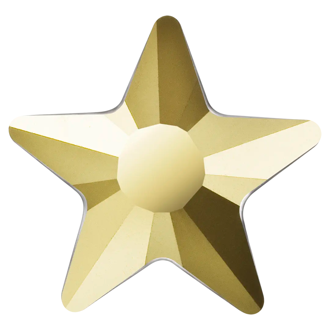 Preciosa rhinestones non hotfix Star in Crystal Aurum are flat back crystals that can easily be applied to most surfaces with glue. Preciosa Star shaped crystals interpret the classic star aymbol with a refined and contemporary character. Defined by balanced geometry and a clean silhouette, the design captures light in a controlled yet expressive way. The precision-cut facets enhance light reflection, producing a bright, elegant sparkle that works beautifully for both subtle accents and standout decorative details.