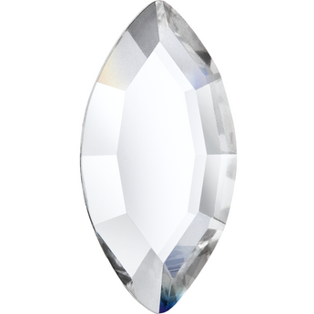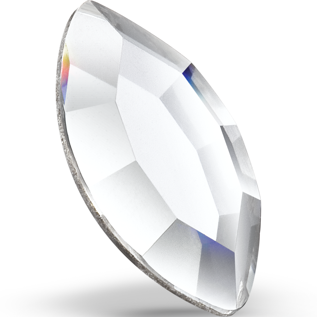 Preciosa rhinestones non hotfix Navette in Crystal are flat back crystals that can easily be applied to most surfaces with glue. Preciosa Navette shaped crystals have an elongated and pointed shape at both ends, resembling a narrow leaf or an almond, hence the name "navette" which is derived from the French word for "little boat". The flat top surface of the crystal is surrounded by beveled edges that catch and reflect light, creating a brilliant and sparkling effect that enhances the overall appearance of the crystal.