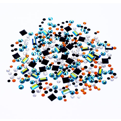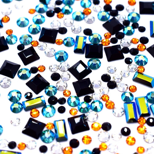 Preciosa rhinestones Kingfisher mix contains a variety of round and shaped flat back crystals in a blend of blue, black and orange colours. Popular with nail technicians and embellishment artists, this mix is a cost effective way to purchase a selection of different crystals.
