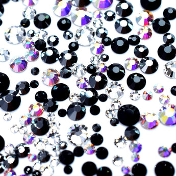 Preciosa rhinestones Midnight mix contains a variety of round flat back crystals in a blend of Crystal, Crystal AB and black colours. Popular with nail technicians and embellishment artists, this mix is a cost effective way to purchase a selection of different crystals.