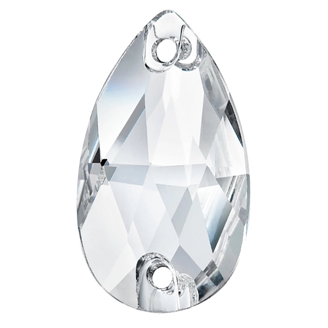 Preciosa sew on crystals Pear (2 Hole) in Crystal are loose flat backed crystals that come with a thread hole, enabling the crystals to be sewn onto fabric. Preciosa Pear shaped sew-ons showcase a traditional pear shape with a tapered design that has a rounded base and a pointed top, resulting in a graceful and balanced appearance. These crystals have a meticulously cut faceted surface that creates an exceptional and dazzling shine, reflecting light from every angle.
