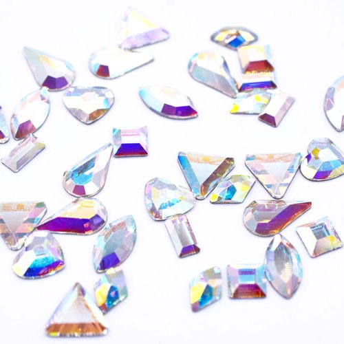 Preciosa rhinestones Crystal AB shapes mix contains a variety of different shaped flat back crystals. Popular with nail technicians and embellishment artists, this mix is a cost effective way to purchase a selection of different crystals.