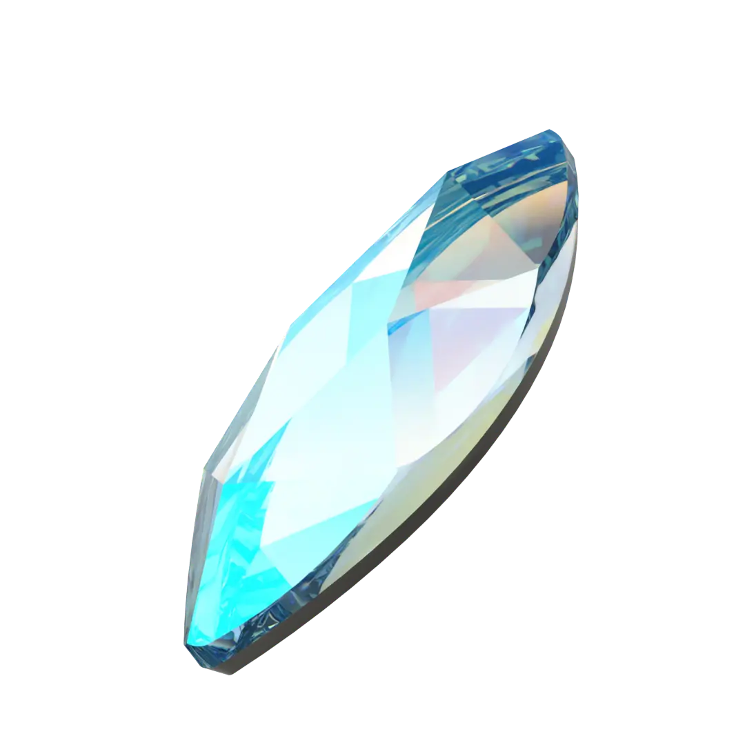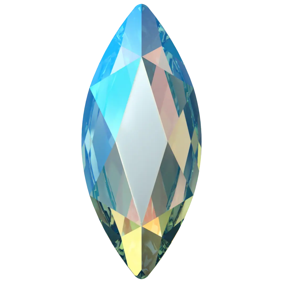 Serinity rhinestones non hotfix Marquise (2201) in Aquamarine Shimmer are flat back crystals that can easily be applied to most surfaces with glue. Serinity Marquise shaped crystals are characterized by an elongated elliptical shape with pointed ends, which gives the impression of a larger size due to its slender and elongated appearance.