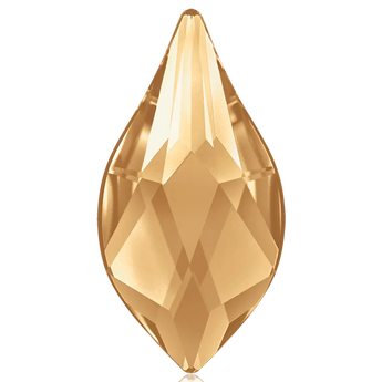 Serinity rhinestones non hotfix Flame (2205) in Crystal Golden Shadow are flat back crystals that can easily be applied to most surfaces with glue. Serinity Flame flat back crystals showcase a distinctive shape reminiscent of a stylized Flame, featuring a tapered, elongated silhouette with a pointed end on one side and a rounded point on the other. The crystal's multi-faceted surface extends to a slight point at the top, producing a brilliant and sparkling effect when reflecting light.