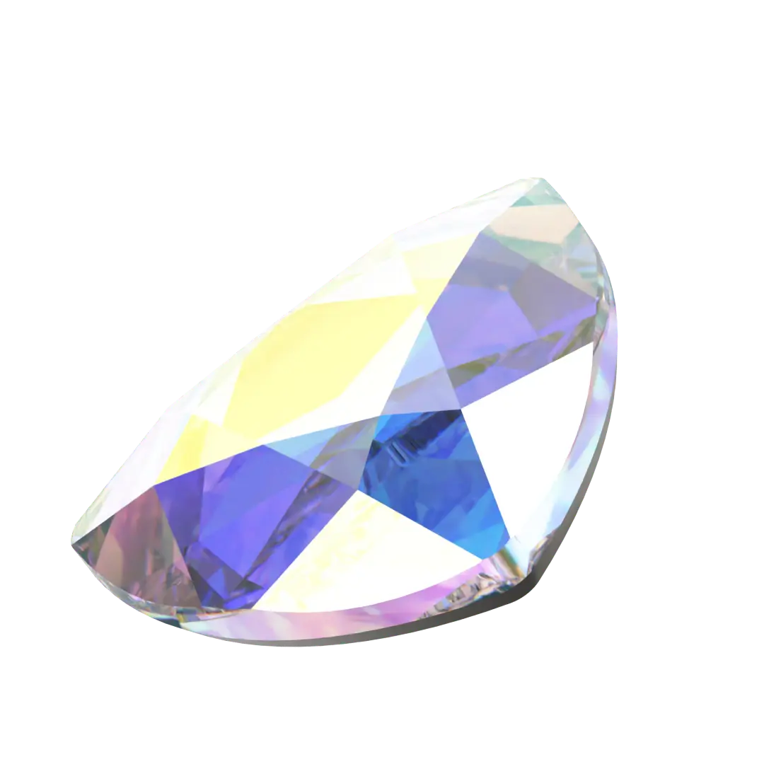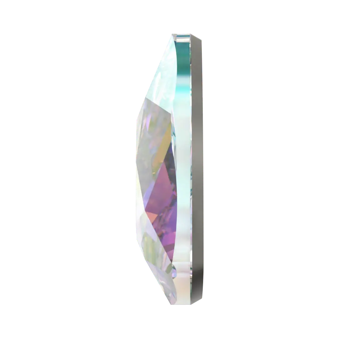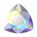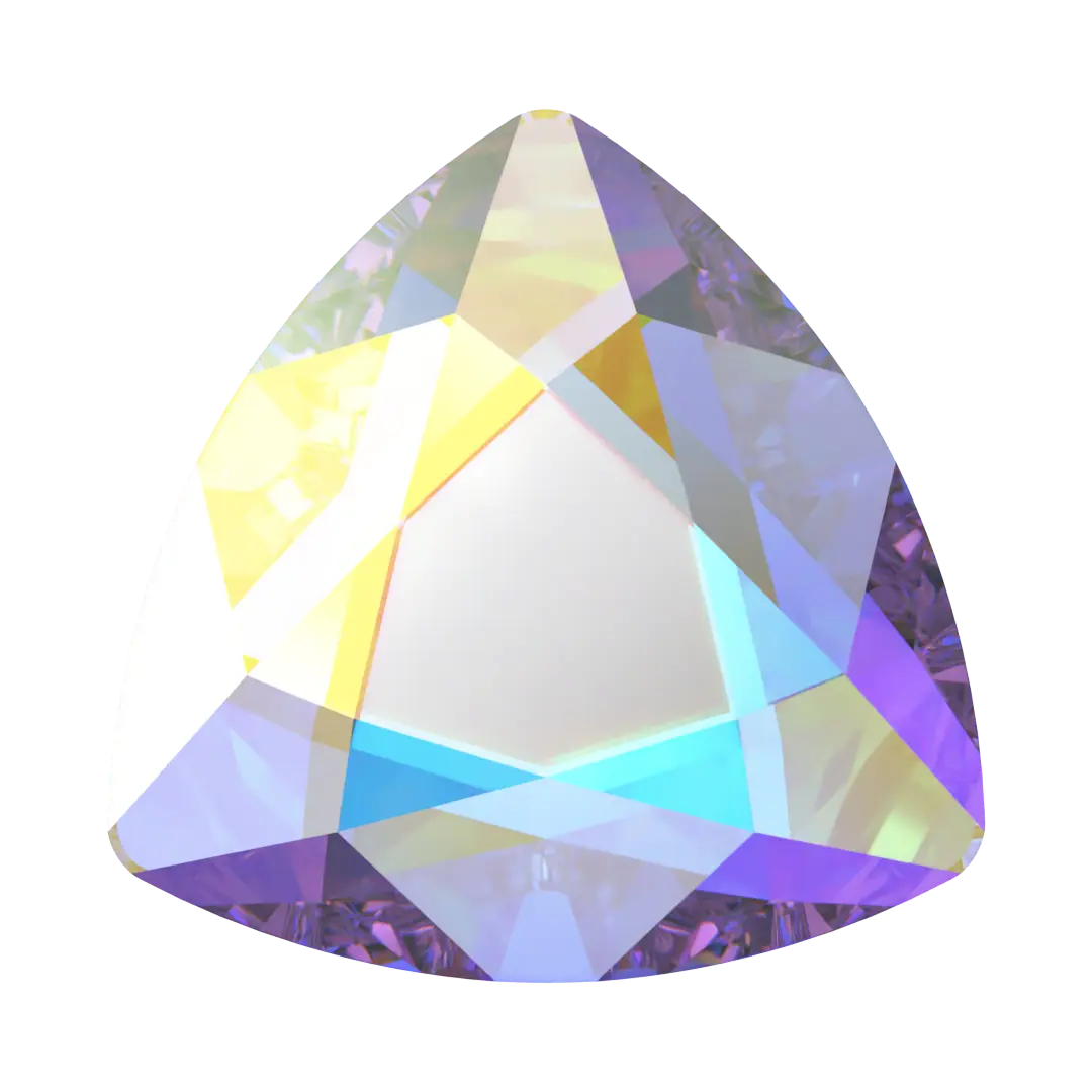Serinity hotfix crystals Trilliant (2472) Crystal AB are flat back crystals where the reverse side of the crystal has been pre-coated with a heat-sensitive glue. Serinity Trilliant shaped crystals feature a unique triangular shape with rounded edges. The crystal has a flat top and faceted edges, which effectively captures and reflects light, creating a stunning and sparkling effect.