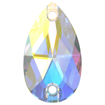 Serinity sew on crystals Peardrop (3230) in Crystal AB are loose flat backed crystals that come with a thread hole, enabling the crystals to be sewn onto fabric. Serinity Peardrop shaped crystals feature a tapered traditional pear shape with a rounded bottom and a pointed top, resulting in a symmetrical and elegant appearance. The crystal's faceted surface is carefully cut to create a stunning and brilliant shine that sparkles from every angle.