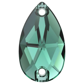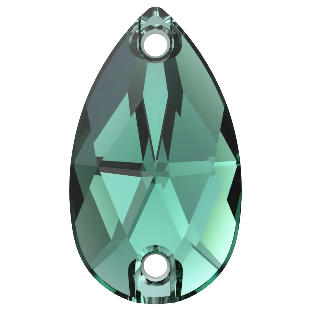 Serinity sew on crystals Peardrop (3230) in Emerald are loose flat backed crystals that come with a thread hole, enabling the crystals to be sewn onto fabric. Serinity Peardrop shaped crystals feature a tapered traditional pear shape with a rounded bottom and a pointed top, resulting in a symmetrical and elegant appearance. The crystal's faceted surface is carefully cut to create a stunning and brilliant shine that sparkles from every angle.