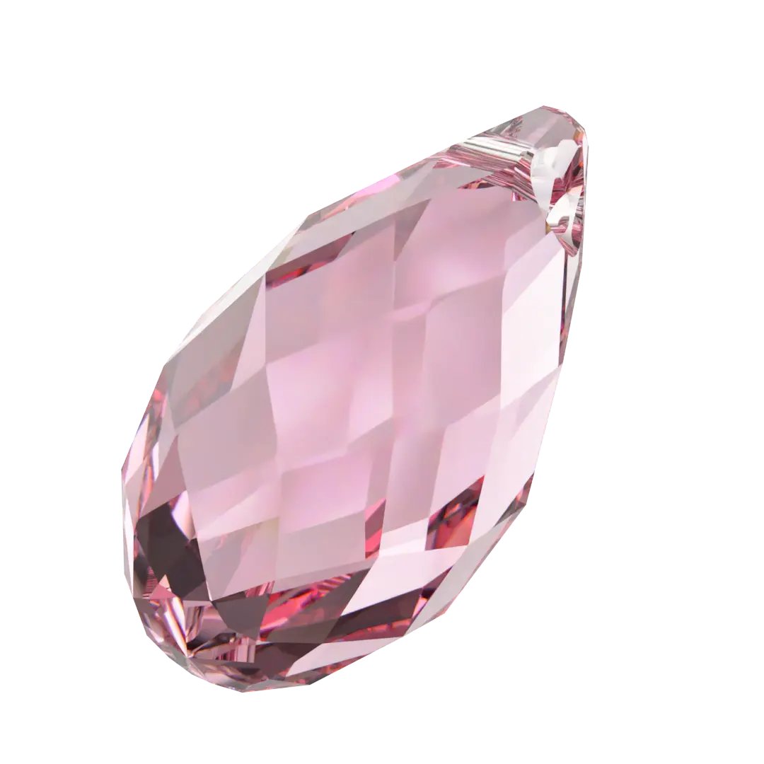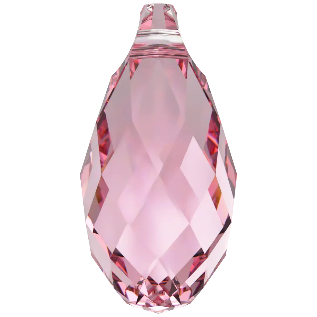 Serinity pendants Briolette (6010) in Light Rose are multi faceted crystals with a thread hole at the top enabling them to be attached to a chain or finding to create a piece of jewellery. Serinity Briolette pendants feature a teardrop shape cut in a specific way called the briolette cut. The briolette cut is a type of faceting that involves cutting the crystal into a series of triangular or diamond-shaped facets, which are arranged in a symmetrical pattern around the crystal.