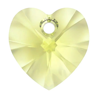 Serinity pendants Heart (6228) in Citrus Green are multi faceted crystals with a thread hole at the top enabling them to be attached to a chain or finding to create a piece of jewellery. Serinity Heart shaped crystals have a classic and timeless design, and the symmetrical faceted crystal cut on the front surface of the heart creates a stunning shine that sparkles from all angles, capturing the gaze of anyone who lays their eyes on them.