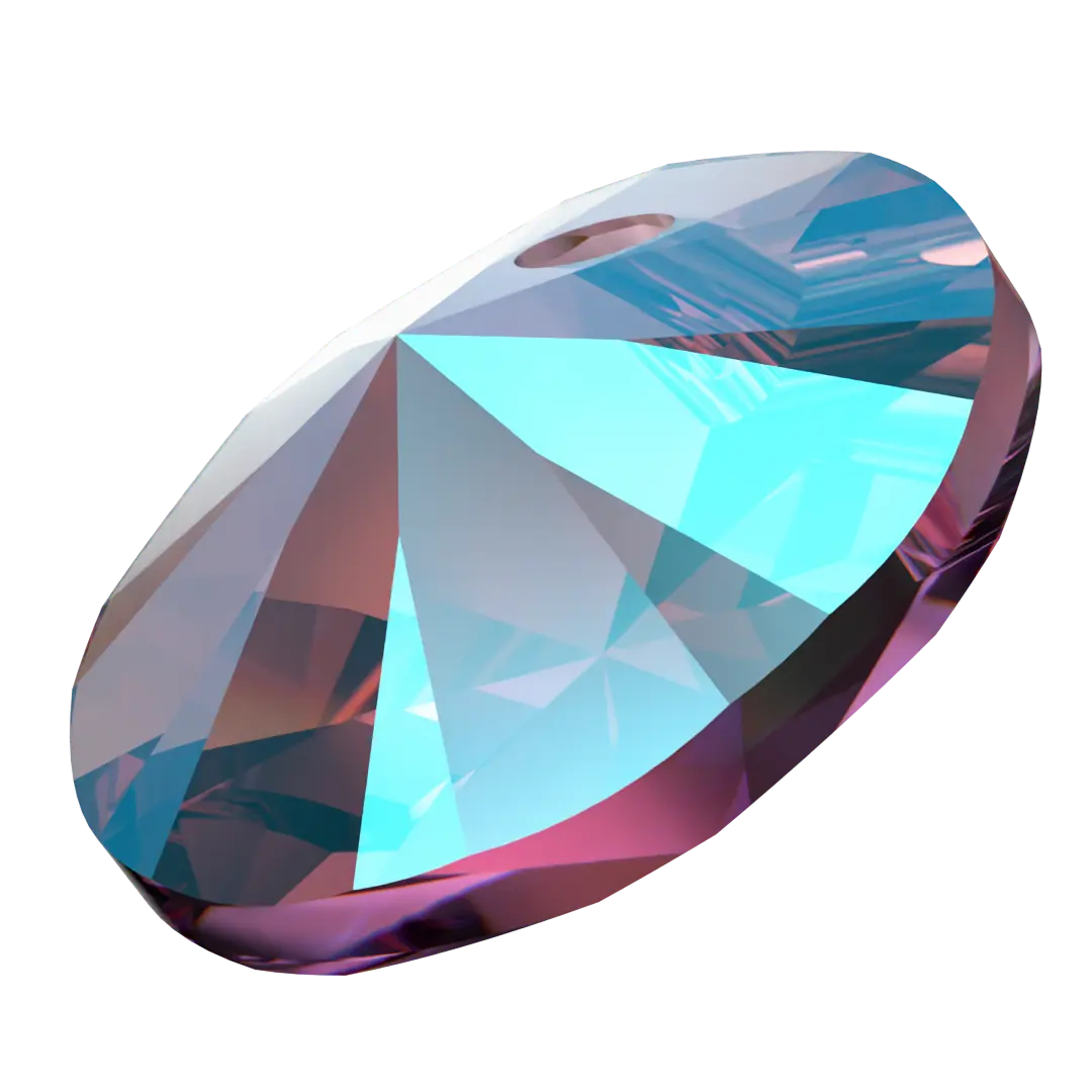 Serinity pendants Round Cut (6428) in Amethyst Shimmer are multi faceted crystals with a thread hole at the top enabling them to be attached to a chain or finding to create a piece of jewellery. Serinity Round Cut pendants have a classic round shape and a modern twist. It features a unique cut with alternating large and small facets, which enhance the stone's brilliance and sparkle.