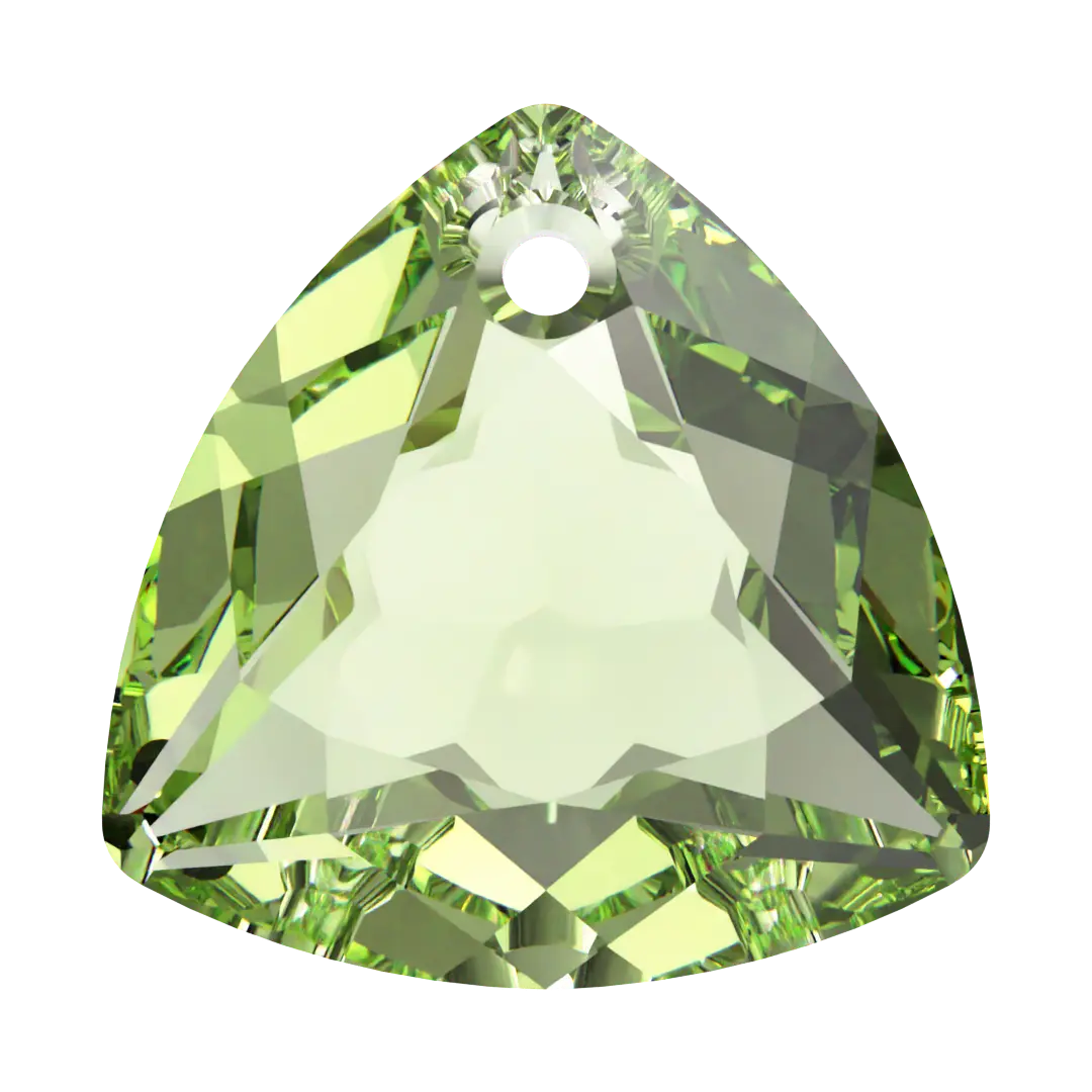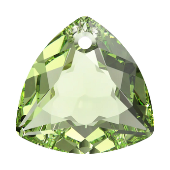 Serinity pendants Trilliant Cut (6434) in Peridot are multi faceted crystals with a thread hole at the top enabling them to be attached to a chain or finding to create a piece of jewellery. Serinity Trilliant Cut refers to a specific type of faceting applied to a crystal. This cut creates a triangular shape with rounded edges and facets arranged in a symmetrical pattern. The result is a brilliant and sparkling crystal with a unique and distinctive shape that is popular in jewellery designs.