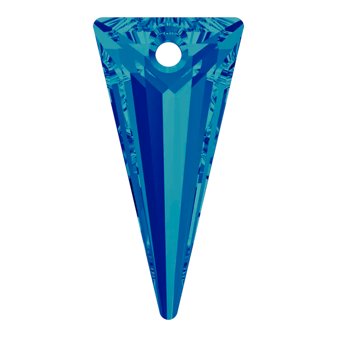 Serinity pendants Spike (6480) in Crystal Bermuda Blue P are multi faceted crystals with a thread hole at the top enabling them to be attached to a chain or finding to create a piece of jewellery. Serinity Spike shaped pendant is a distinctive elongated triangle shape with a tapered, spike-like silhouette. Its unique shape makes it a versatile pendant that can be incorporated into a variety of jewellery designs, from edgy and rock-inspired to elegant and sophisticated.