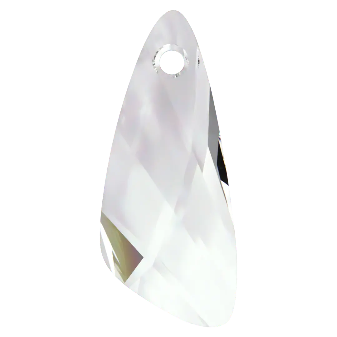 Serinity pendants Wing (6690) in Crystal are multi faceted crystals with a thread hole at the top enabling them to be attached to a chain or finding to create a piece of jewellery. Serinity Wing shaped crystals have a rectangular base that gradually narrows towards the top, resembling the shape of a wing. These crystals are carefully cut with intricate facets that capture and reflect light, resulting in a stunning and sparkling appearance.
