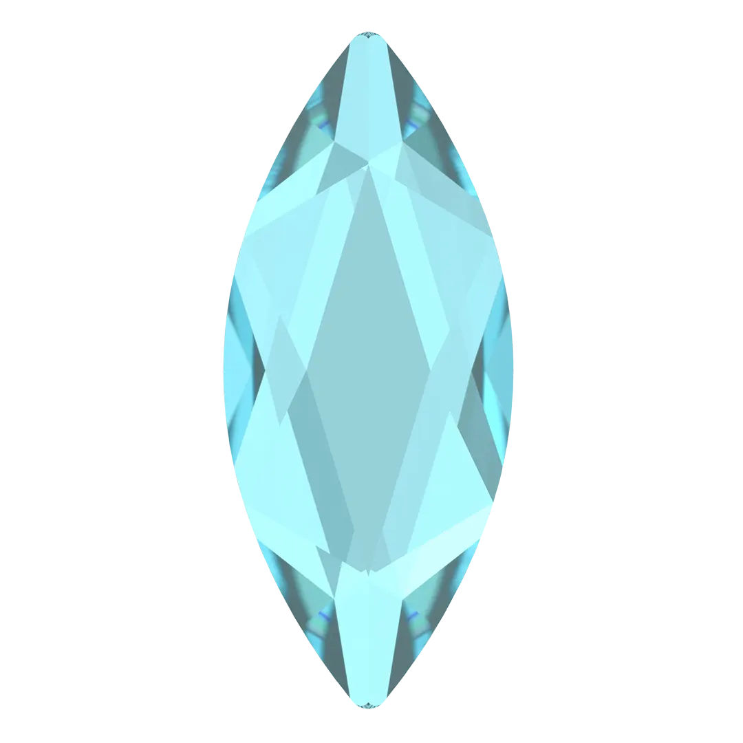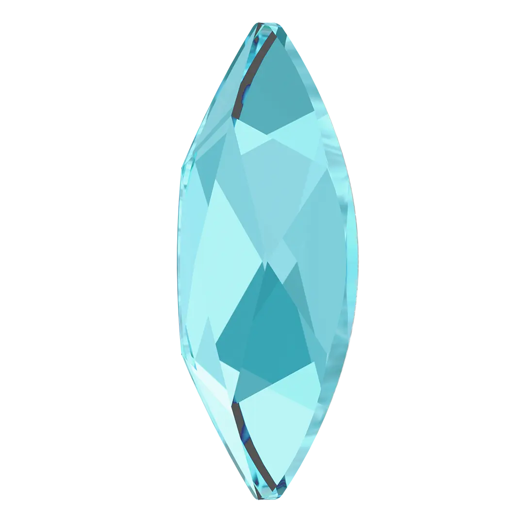 Swarovski rhinestones non hotfix Marquise (2201) in Aquamarine are flat back crystals that can easily be applied to most surfaces with glue. Swarovski Marquise shaped crystals are an elongated elliptical shape that has pointed ends, creating the illusion of greater size due to its long narrow shape.
