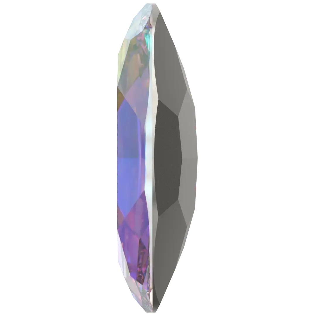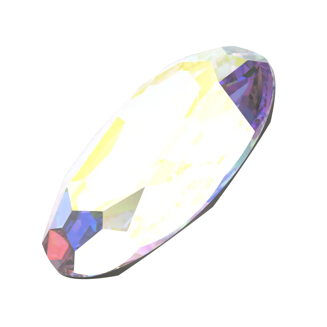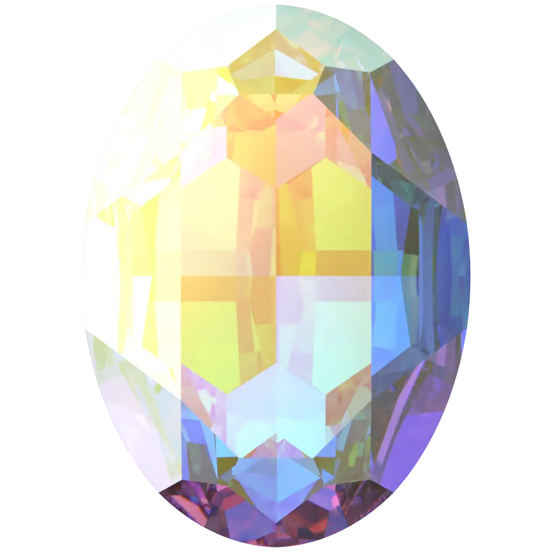 Swarovski fancy stones Big Oval (4127) in Crystal AB are multi faceted pointed back crystals that have no thread hole and can be applied to fabric or to create jewellery designs using metal settings or in pre-made cavities. Swarovski Big Oval shaped crystals are an elongated elliptical shape with rounded ends. They have a multi-faceted surface that create a multi-faceted effect, which gives them a sparkling and radiant appearance.