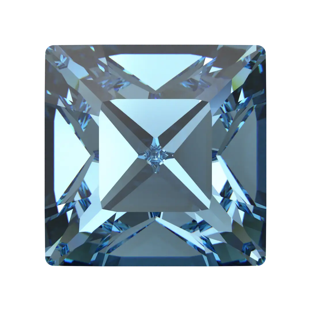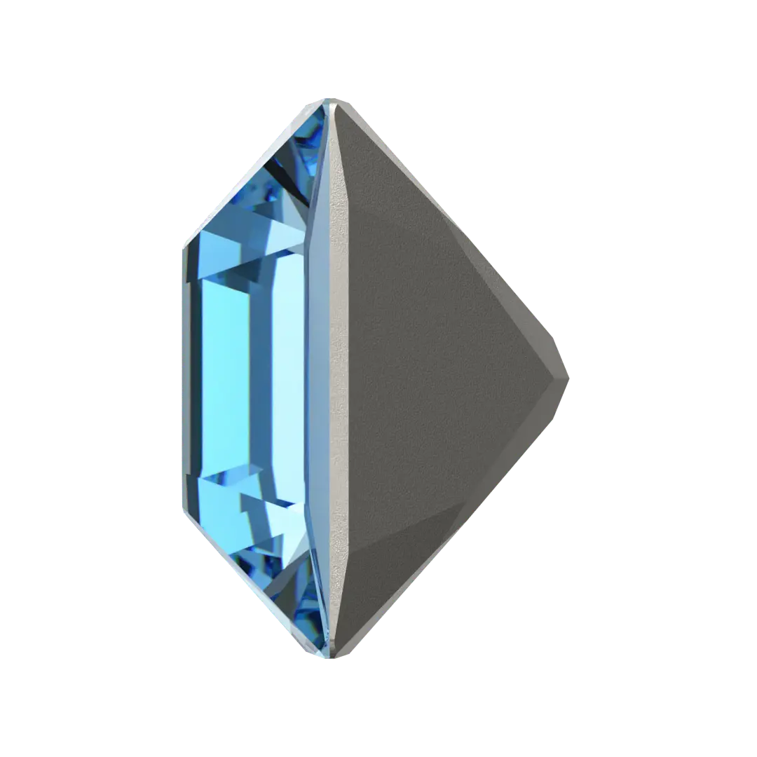Swarovski fancy stones Xilion Square (4428) in Aquamarine are multi faceted pointed back crystals that have no thread hole and can be applied to fabric or to create jewellery designs using metal settings or in pre-made cavities. Swarovski Xilion Square stone is a crystal component that features a square shape with sharp, clean edges and a unique faceting pattern. The Xilion cut has alternating large and small facets that enhance the stone's brilliance, creating a sparkling and dazzling effect that adds a touch of elegance and sophistication to any jewellery design.