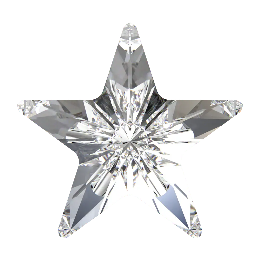 Swarovski fancy stones Star (4745) in Crystal are multi faceted pointed back crystals that have no thread hole and can be applied to fabric or to create jewellery designs using metal settings or in pre-made cavities. Swarovski Star shaped crystals are designed to mimic the brilliance and radiance of stars. These crystals have a central point and multiple facets extending outwards in a symmetrical pattern, which creates a dazzling star-like effect. The faceting is precision-cut to maximize the reflection and refraction of light, resulting in a shimmering and glittering appearance.