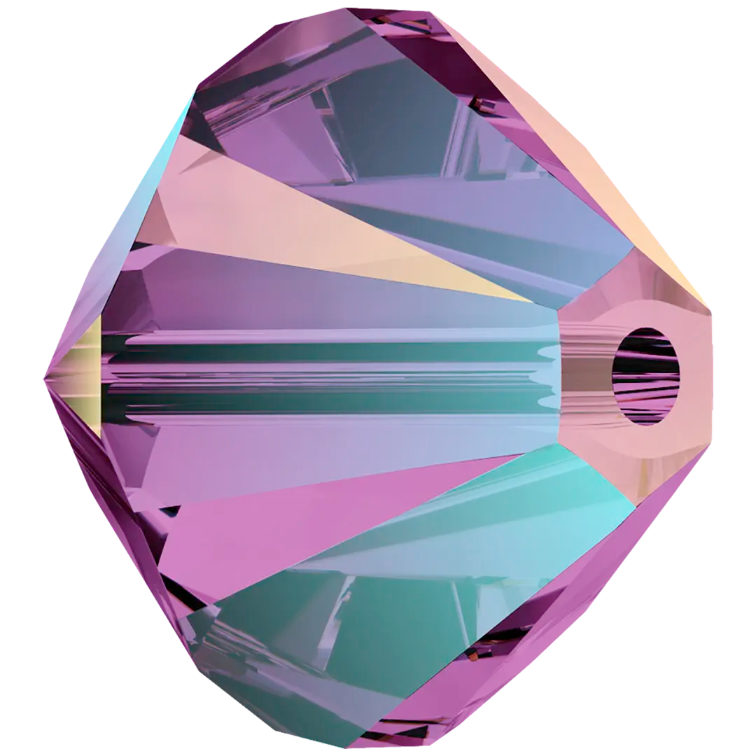 Swarovski crystal beads Xilion Bicone (5328) in Amethyst Shimmer 2X have a smooth thread hole and are multi-faceted to reflect the light, making them perfect to create bespoke designs. Swarovski Bicone beads are cylindrical in shape and taper at both ends to form a bi-conical shape. The tapered multi-faceted shape of bicone beads adds texture, dimension and sparkle to jewellery and bespoke designs.