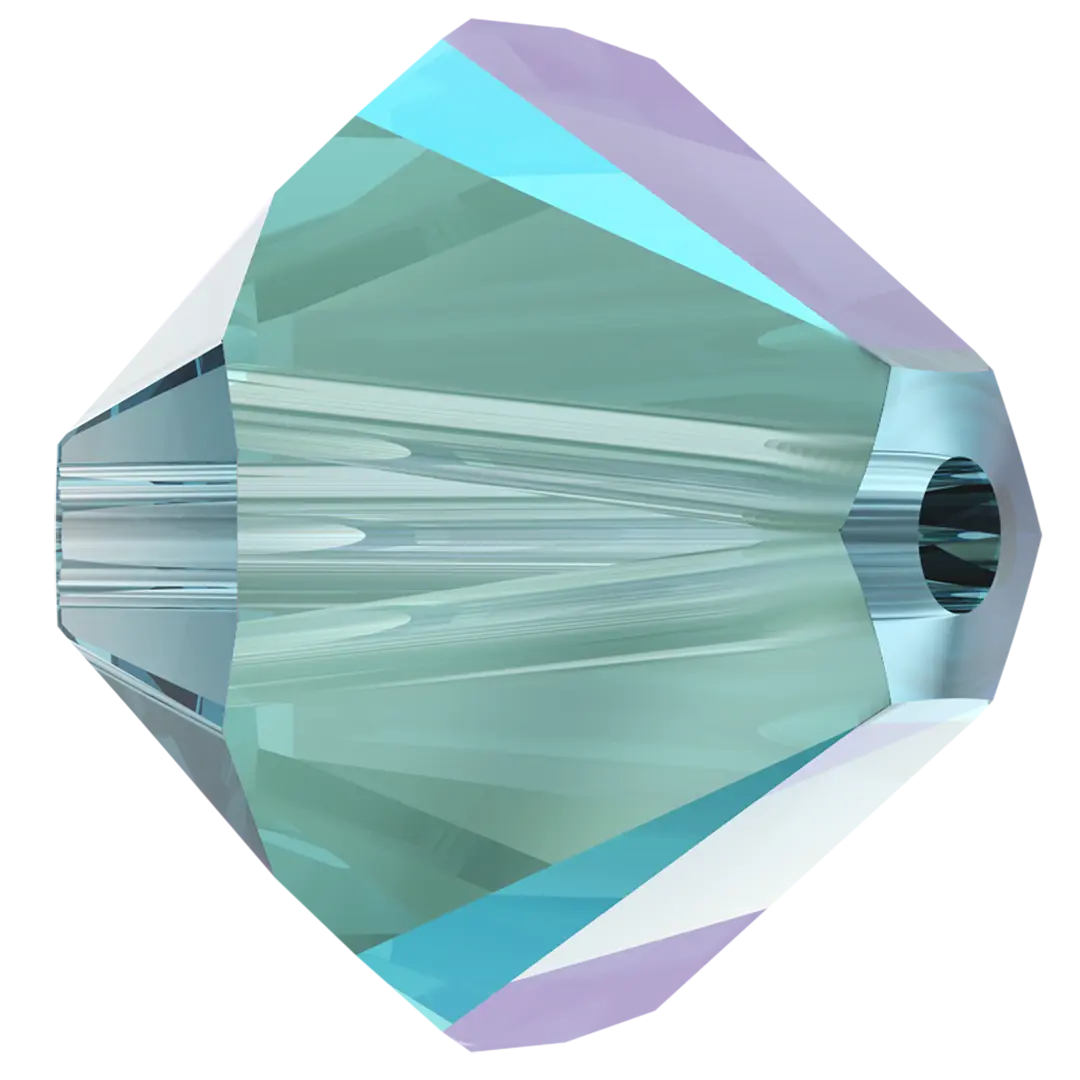 Swarovski crystal beads Xilion Bicone (5328) in Aquamarine Shimmer have a smooth thread hole and are multi-faceted to reflect the light, making them perfect to create bespoke designs. Swarovski Bicone beads are cylindrical in shape and taper at both ends to form a bi-conical shape. The tapered multi-faceted shape of bicone beads adds texture, dimension and sparkle to jewellery and bespoke designs.
