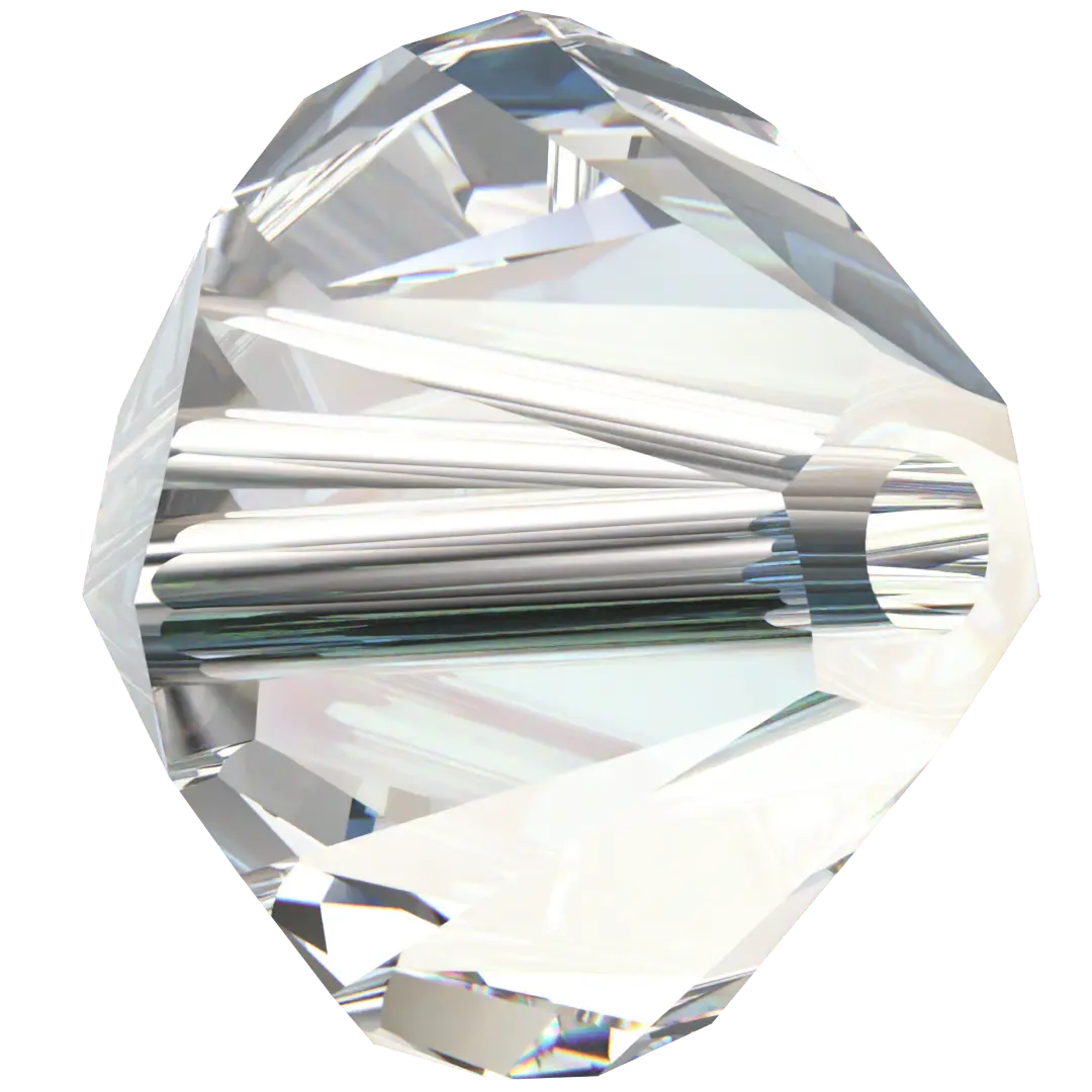Swarovski crystal beads Xilion Bicone (5328) in Crystal Moonlight have a smooth thread hole and are multi-faceted to reflect the light, making them perfect to create bespoke designs. Swarovski Bicone beads are cylindrical in shape and taper at both ends to form a bi-conical shape. The tapered multi-faceted shape of bicone beads adds texture, dimension and sparkle to jewellery and bespoke designs.