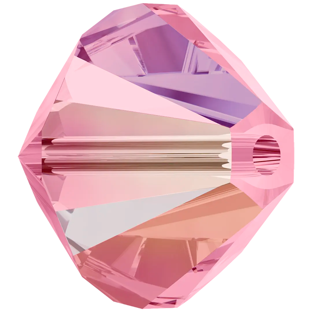 Swarovski crystal beads Xilion Bicone (5328) in Light Rose AB have a smooth thread hole and are multi-faceted to reflect the light, making them perfect to create bespoke designs. Swarovski Bicone beads are cylindrical in shape and taper at both ends to form a bi-conical shape. The tapered multi-faceted shape of bicone beads adds texture, dimension and sparkle to jewellery and bespoke designs.
