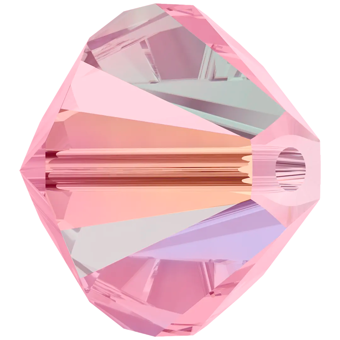 Swarovski crystal beads Xilion Bicone (5328) in Light Rose AB 2X have a smooth thread hole and are multi-faceted to reflect the light, making them perfect to create bespoke designs. Swarovski Bicone beads are cylindrical in shape and taper at both ends to form a bi-conical shape. The tapered multi-faceted shape of bicone beads adds texture, dimension and sparkle to jewellery and bespoke designs.