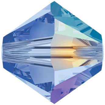 Swarovski crystal beads Xilion Bicone (5328) in Light Sapphire AB have a smooth thread hole and are multi-faceted to reflect the light, making them perfect to create bespoke designs. Swarovski Bicone beads are cylindrical in shape and taper at both ends to form a bi-conical shape. The tapered multi-faceted shape of bicone beads adds texture, dimension and sparkle to jewellery and bespoke designs.