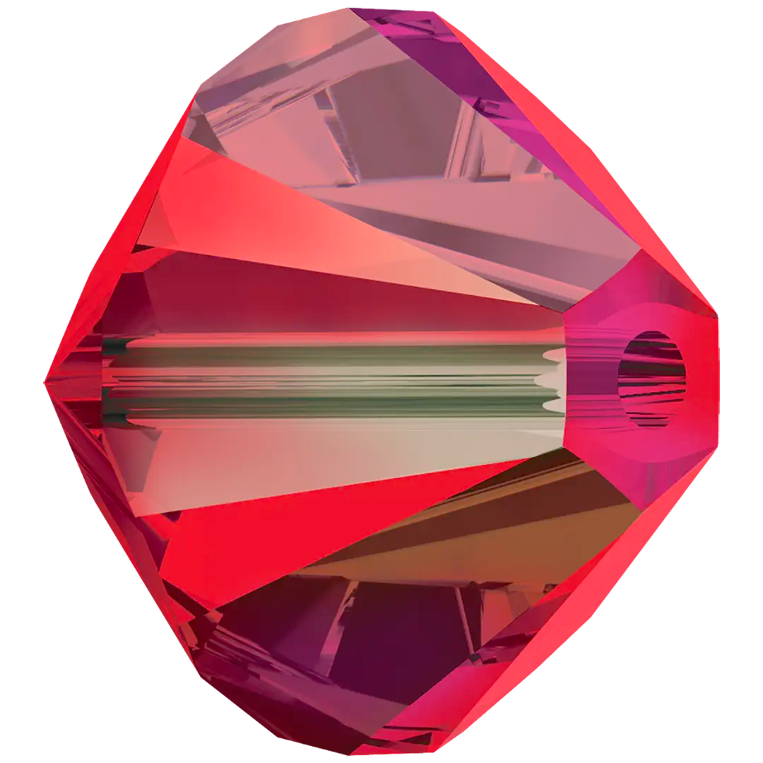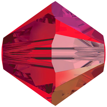 Swarovski crystal beads Xilion Bicone (5328) in Light Siam AB have a smooth thread hole and are multi-faceted to reflect the light, making them perfect to create bespoke designs. Swarovski Bicone beads are cylindrical in shape and taper at both ends to form a bi-conical shape. The tapered multi-faceted shape of bicone beads adds texture, dimension and sparkle to jewellery and bespoke designs.