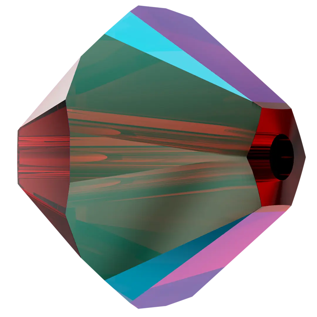 Swarovski crystal beads Xilion Bicone (5328) in Siam Shimmer 2X have a smooth thread hole and are multi-faceted to reflect the light, making them perfect to create bespoke designs. Swarovski Bicone beads are cylindrical in shape and taper at both ends to form a bi-conical shape. The tapered multi-faceted shape of bicone beads adds texture, dimension and sparkle to jewellery and bespoke designs.