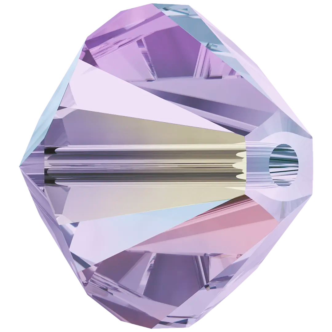Swarovski crystal beads Xilion Bicone (5328) in Violet AB have a smooth thread hole and are multi-faceted to reflect the light, making them perfect to create bespoke designs. Swarovski Bicone beads are cylindrical in shape and taper at both ends to form a bi-conical shape. The tapered multi-faceted shape of bicone beads adds texture, dimension and sparkle to jewellery and bespoke designs.