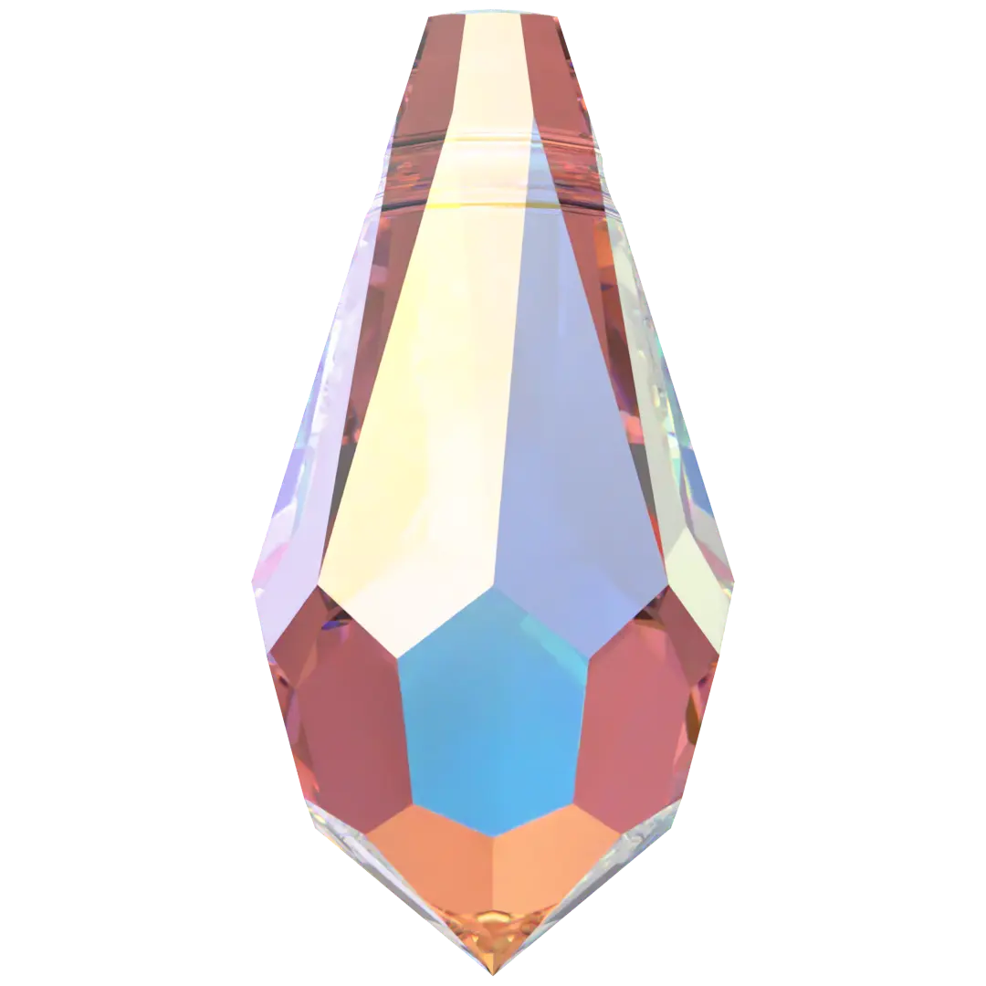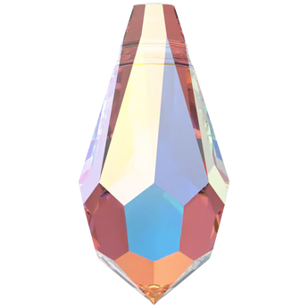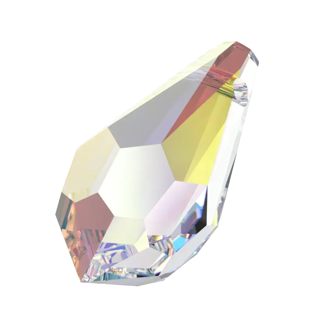 Swarovski pendants Teardrop (6000) in Crystal AB are multi faceted crystals with a thread hole at the top enabling them to be attached to a chain or finding to create a piece of jewellery. Swarovski Teardrop shaped crystals have a distinctive teardrop shape. They have a pointed top and a rounded bottom with facets arranged in a symmetrical pattern, which create a dazzling play of light and reflection.