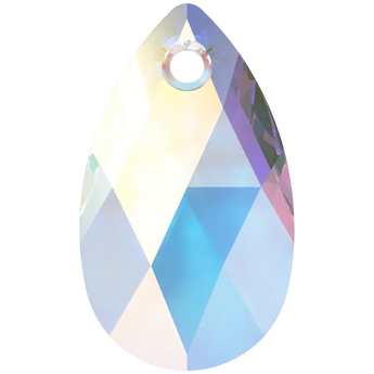 Swarovski pendants Peardrop (6106) in Crystal AB are multi faceted crystals with a thread hole at the top enabling them to be attached to a chain or finding to create a piece of jewellery. Swarovski Peardrop shaped crystals are traditional pear in shape with a rounded bottom and a pointed top. They have a symmetrical shape with a faceted surface that creates a brilliant shine and sparkle.