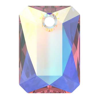 Swarovski pendants Emerald Cut (6435) in Crystal AB are multi faceted crystals with a thread hole at the top enabling them to be attached to a chain or finding to create a piece of jewellery. Swarovski Emerald Cut is a type of crystal cut that mimics the shape of an emerald gemstone. It is a rectangular shape with cut corners, and its flat top surface is usually divided into facets, creating a step-like effect. The Emerald Cut is known for its elegant and sophisticated appearance, and it is often used in high-end jewellery and fashion designs.