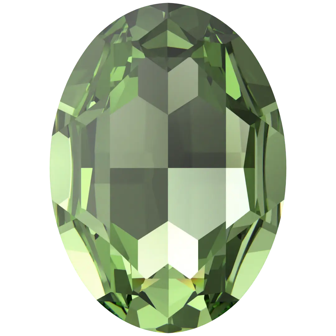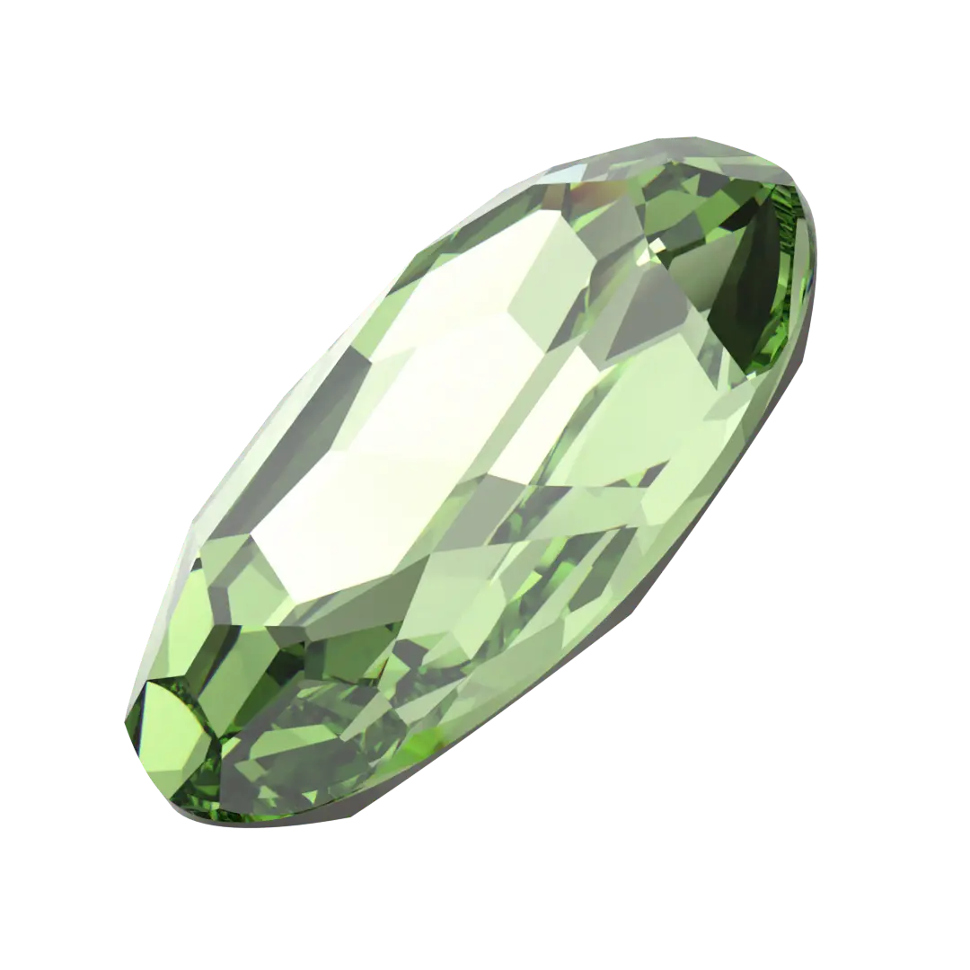 Swarovski fancy stones Big Oval (4127) in Peridot are multi faceted pointed back crystals that have no thread hole and can be applied to fabric or to create jewellery designs using metal settings or in pre-made cavities. Swarovski Big Oval shaped crystals are an elongated elliptical shape with rounded ends. They have a multi-faceted surface that create a multi-faceted effect, which gives them a sparkling and radiant appearance.