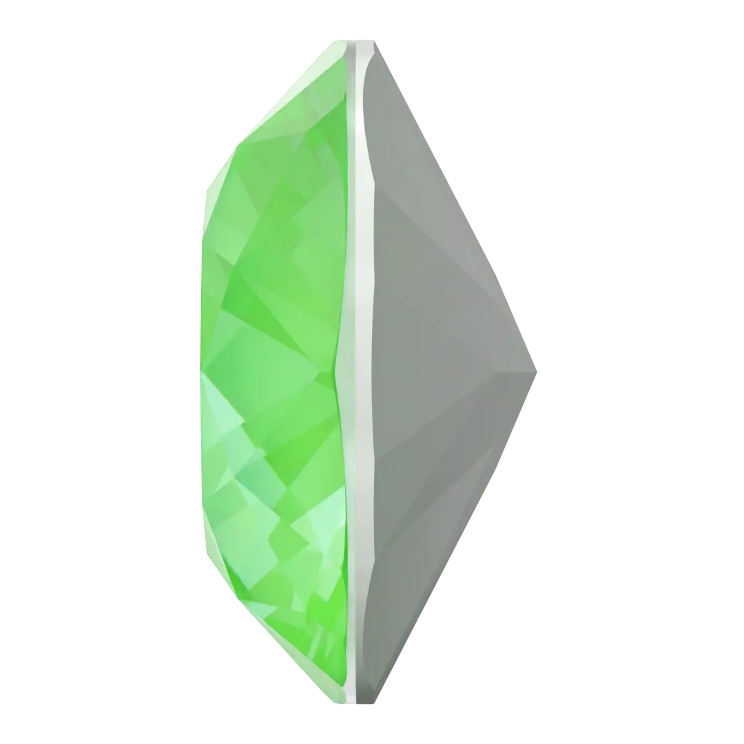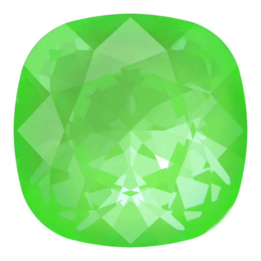 Swarovski fancy stones Cushion Square (4470) in Crystal Electric Green Ignite UNFOILED are multi faceted pointed back crystals that have no thread hole and can be applied to fabric or to create jewellery designs using metal settings or in pre-made cavities. Swarovski Cushion Square stone is a crystal stone that features a square shape with rounded edges, giving it a cushion-like appearance. The stone is cut with multiple facets, which enhances its brilliance and creates a beautiful sparkle.