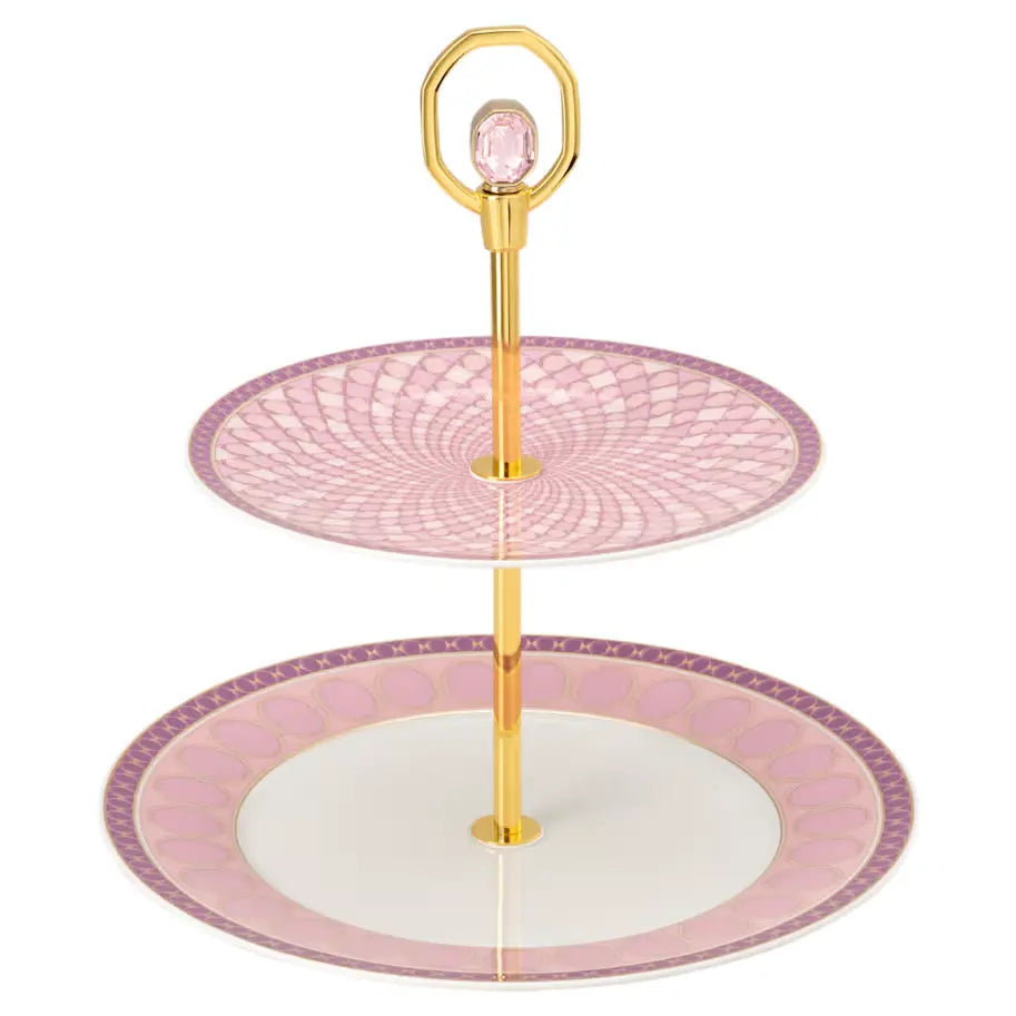 The perfect blend of sweetness and sophistication, this two-tier étagère will bring elegance to any table. Crafted from porcelain, each level of this spectacular cake stand features a pink geometric pattern inspired by Swarovski’s signature octagon. The octagon also appears on the gold-tone handle, alongside a single pink crystal. This étagère was created in partnership with porcelain brand Rosenthal.
